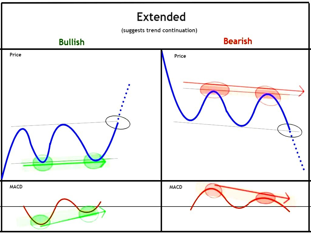 التباعد الممتد هو تباين صعودي أو هبوطي يحدث لفترة أطول. ويحدث عادة عندما يتحرك السوق جانبيًا، ولا توجد الكثير من الارتفاعات والانخفاضات. ويمكن أن يستمر هذا النوع من التباعد لعدة أيام أو أسابيع. وعادةً ما يعتبر المتداولون إشارات التباعد الممتد أكثر أهمية لأنها توفر تأكيدًا على انعكاس الاتجاه أو استمراره لفترة أطول.