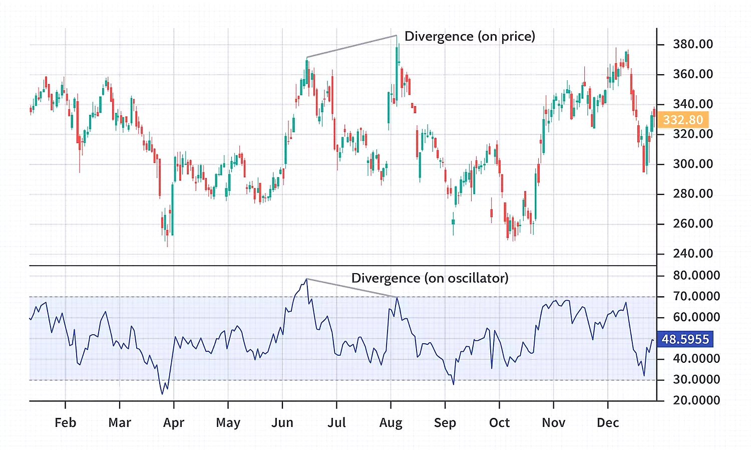 نظرًا لأنها تقيس سرعة وقوة تحركات الأسعار، فإنها تظهر كخطوط تتقلب مثل تحركات أسعار الرموز. عندما يتحرك الخط الفعلي الذي يمثل حركة السعر في اتجاه مختلف عن خط المذبذب، يحدث التباعد.