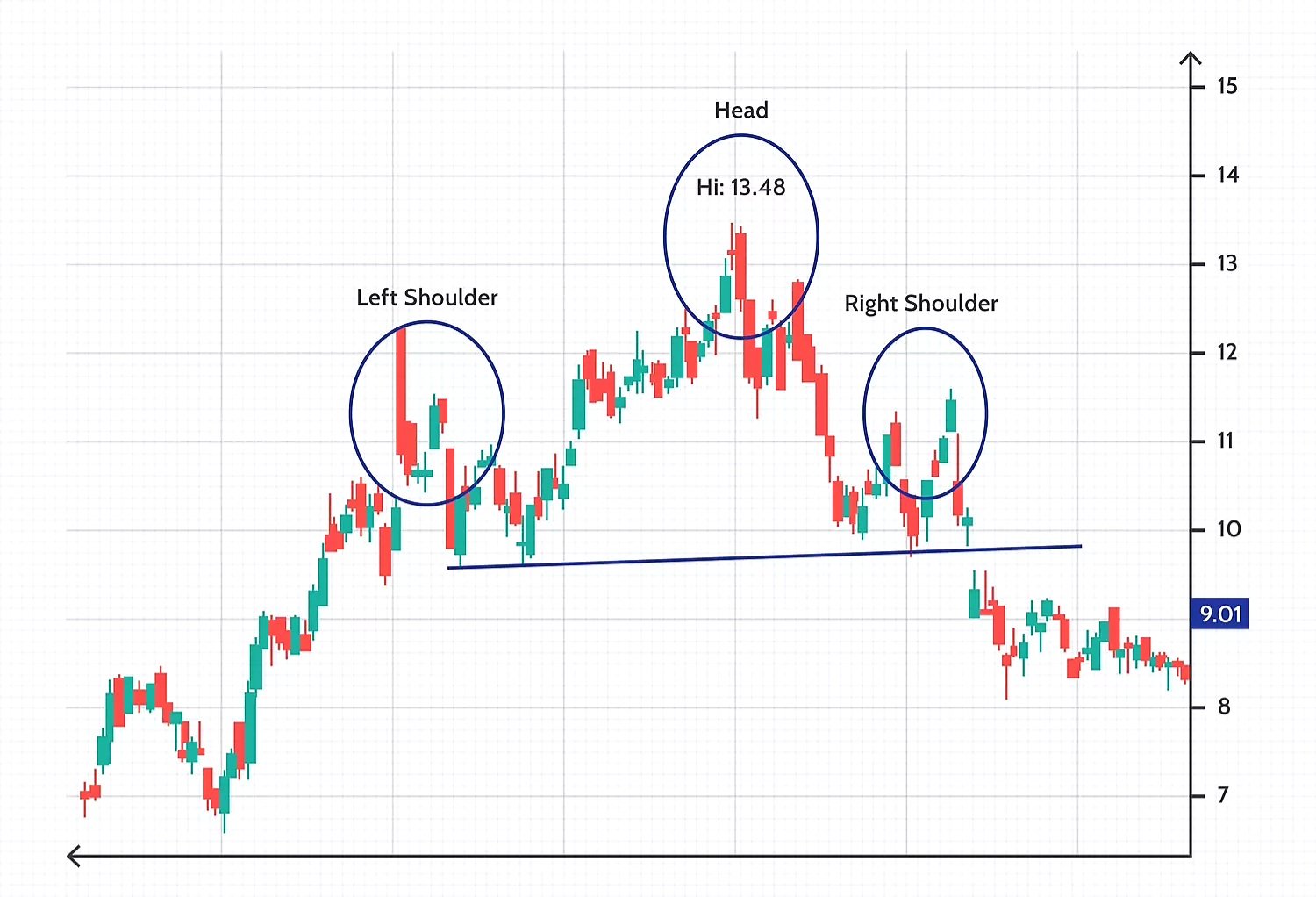 نمط الرسم البياني للرأس والكتفين هو نمط شائع وسهل الرصد في التحليل الفني . يظهر خط الأساس بثلاث قمم حيث تكون القمة الوسطى هي الأعلى. يصور نمط الرسم البياني للرأس والكتفين انعكاس الاتجاه من الصعود إلى الهبوط ويشير إلى أن الاتجاه الصعودي يقترب من نهايته.