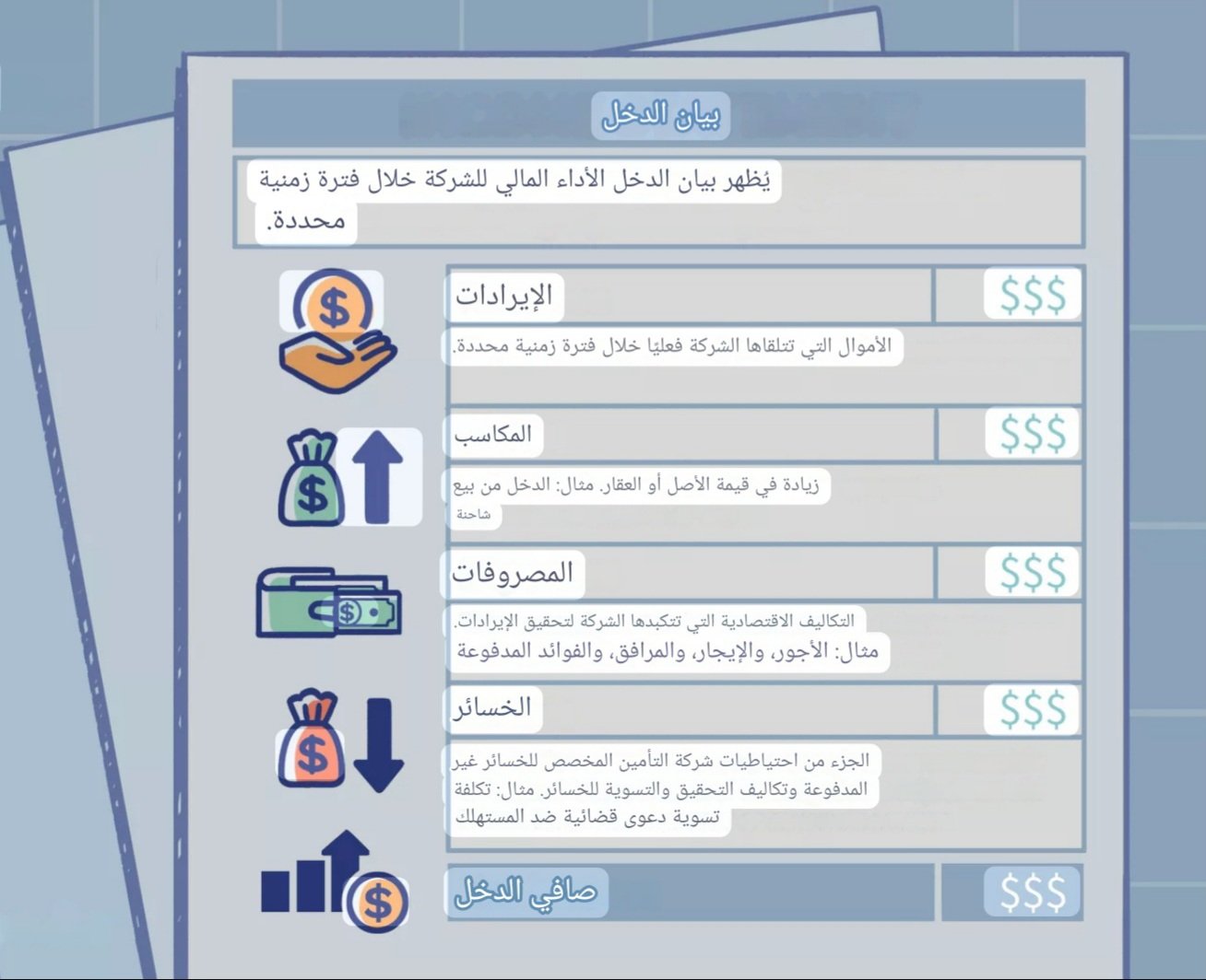 يُظهر بيان الدخل إيرادات الشركة ونفقاتها وأرباحها وخسائرها، بدءًا من الإيرادات وانتهاءً بالدخل الصافي.