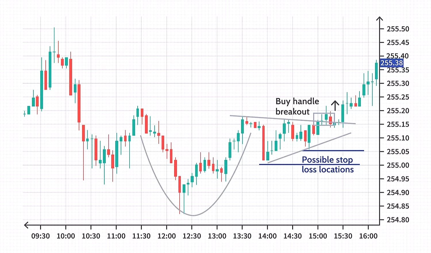 يتشكل “المقبض” على الجانب الأيمن من الكأس في هيئة تراجع قصير يشبه نمط العلم أو الراية. وبمجرد اكتمال المقبض، قد ينطلق السهم إلى مستويات مرتفعة جديدة ويستأنف اتجاهه الصعودي.