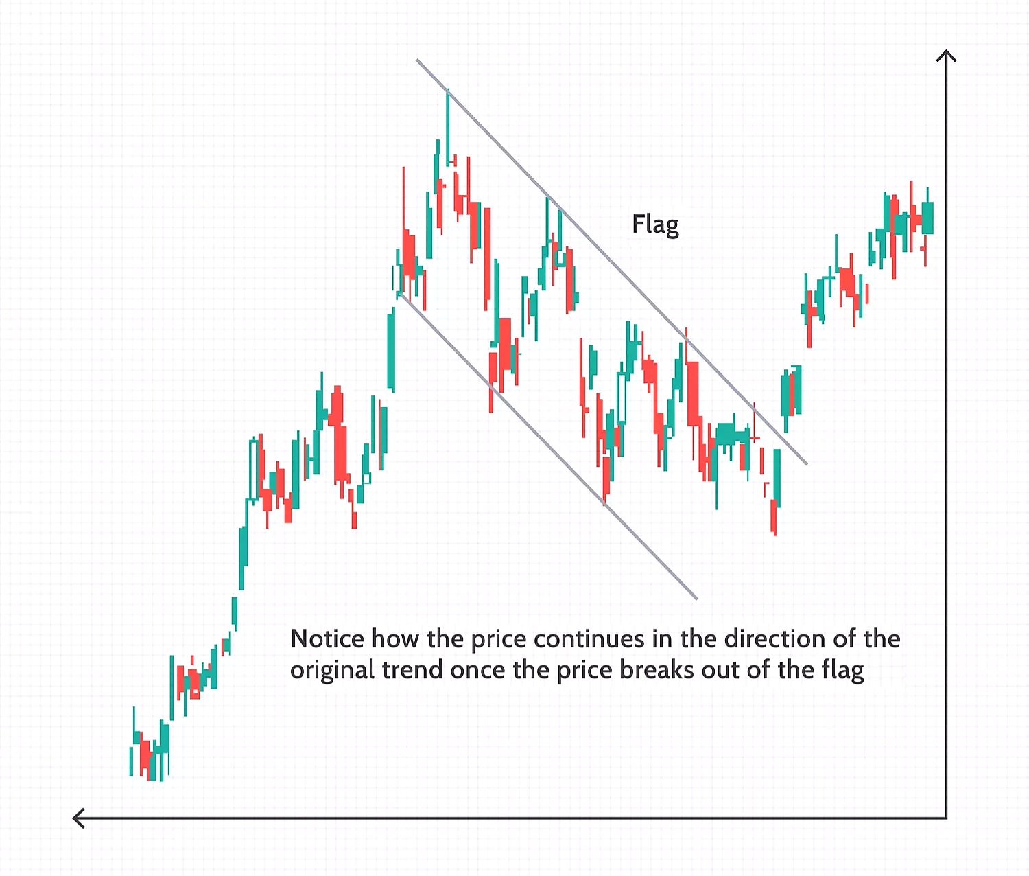 الأعلام هي أنماط استمرارية مبنية باستخدام خطي اتجاه متوازيين يمكن أن ينحدرا لأعلى أو لأسفل أو جانبيًا (أفقيًا). بشكل عام، يظهر العلم ذو المنحدر الصاعد (صاعد) كتوقف مؤقت في سوق متجه نحو الهبوط؛ بينما يظهر العلم ذو الميل الهبوطي (هبوطي) انقطاعًا أثناء سوق متجه نحو الصعود. عادةً ما يكون تشكيل العلم مصحوبًا بانخفاض في الحجم، والذي يتعافى عندما يخرج السعر من تشكيل العلم.