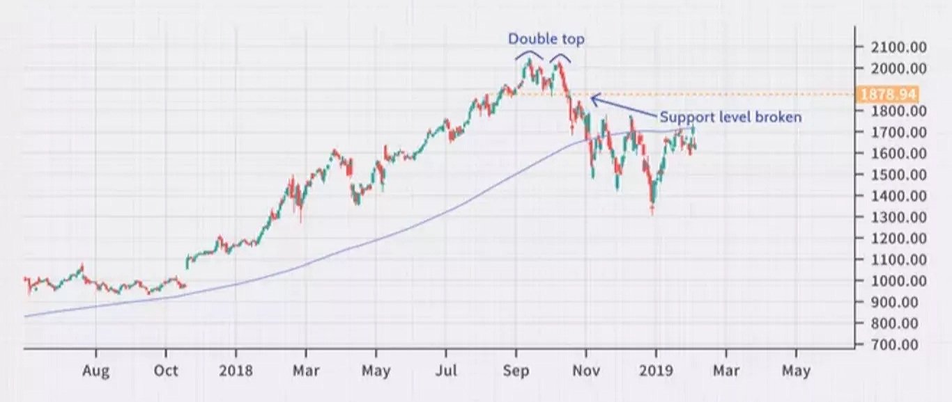 غالبًا ما يبدو القمة المزدوجة مثل الحرف M وهو عبارة عن دفعة أولية إلى مستوى المقاومة تليها محاولة فاشلة ثانية، مما يؤدي إلى عكس الاتجاه.