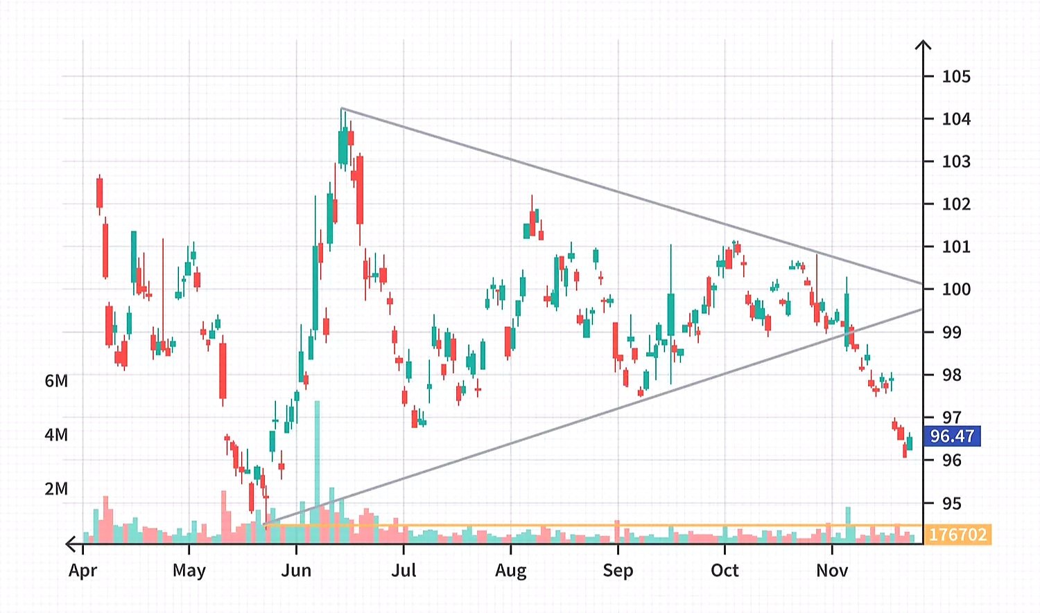 يلعب الحجم دورًا في هذه الأنماط، حيث يتناقص غالبًا أثناء تكوين النمط ويزداد مع خروج السعر من النمط. يبحث المحللون الفنيون عن أنماط الأسعار للتنبؤ بسلوك الأسعار في المستقبل، بما في ذلك استمرار الاتجاه وانعكاساته