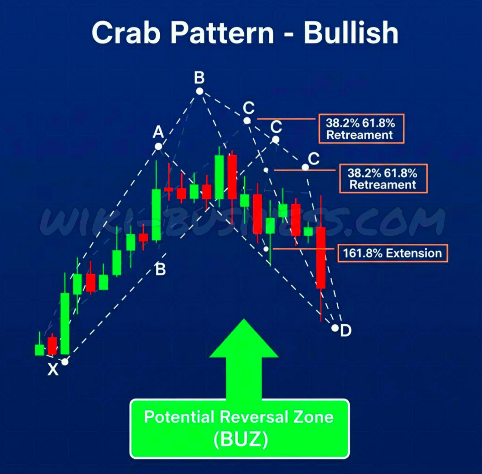 النقطة D: تمتد إلى 1.618 (161.8%) من الضلع XA. يمكن أن يمتد الضلع CD بشكل كبير.
