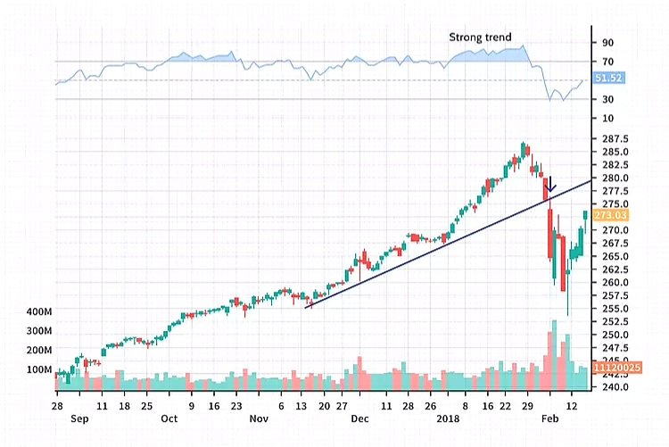 مع انخفاض السعر، يبدأ في جذب المشترين المهتمين بالسعر المنخفض. يمكن أيضًا رسم خط اتجاه آخر (غير موضح) على طول السعر الهابط للإشارة إلى موعد حدوث ارتداد. من المحتمل أن يكون خط الاتجاه هذا قد تم اختراقه بالقرب من منتصف فبراير حيث سجل السعر قاعًا سريعًا على شكل حرف V ثم تقدم إلى الأعلى.