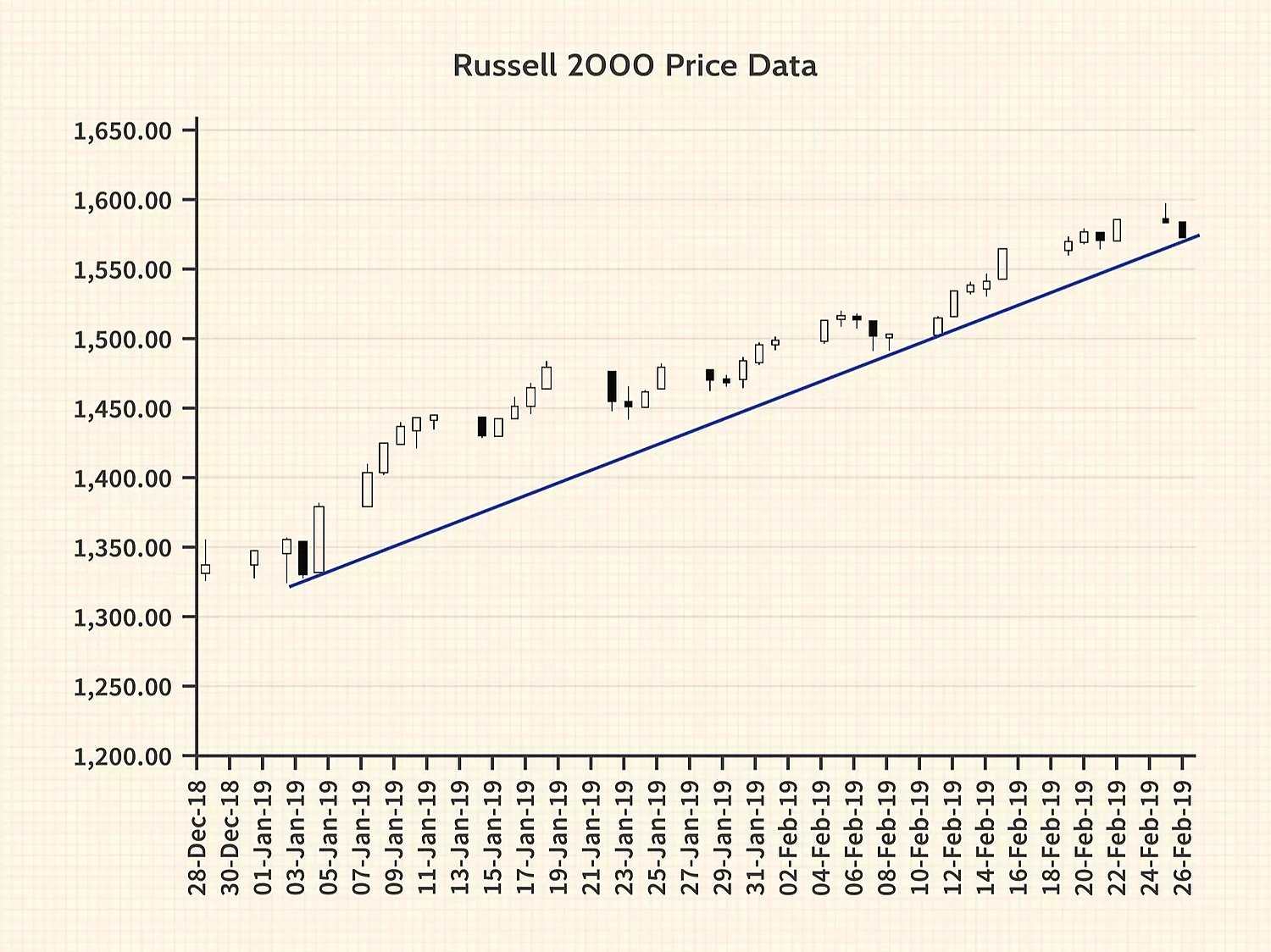 تعتبر خطوط الاتجاه سهلة الاستخدام نسبيًا. فكل ما على المتداول فعله هو رسم بيانات الأسعار بشكل طبيعي، باستخدام الافتتاح والإغلاق والارتفاع والانخفاض. فيما يلي بيانات مؤشر راسل 2000 في مخطط الشموع مع تطبيق خط الاتجاه على أدنى مستويات الجلسة الثلاثة على مدى شهرين.