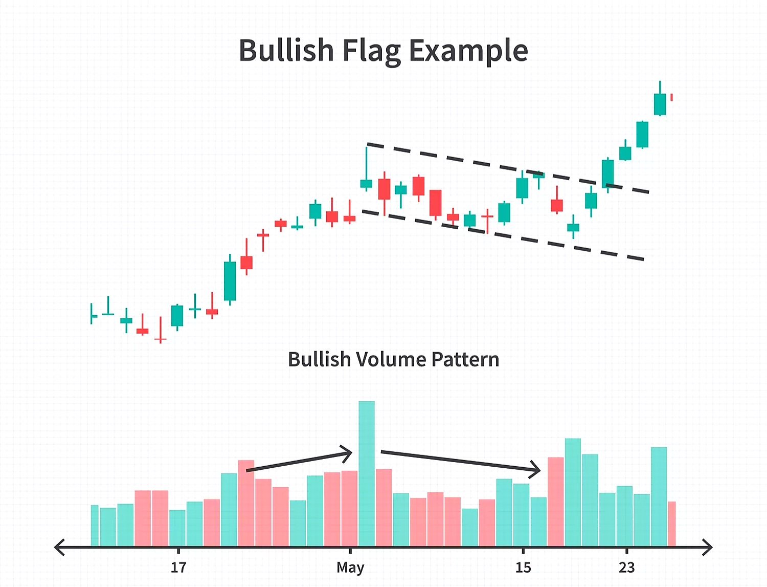 في هذا المثال لنمط العلم الصاعد، يرتفع سعر السهم أثناء تحرك الاتجاه الأولي ثم ينخفض خلال منطقة التوحيد. قد لا يكون الاختراق مصحوبًا دائمًا بارتفاع كبير في الحجم، لكن المحللين والتجار يفضلون رؤية ذلك لأنه يعني أن المستثمرين والتجار الآخرين دخلوا السهم في موجة جديدة من الحماس.