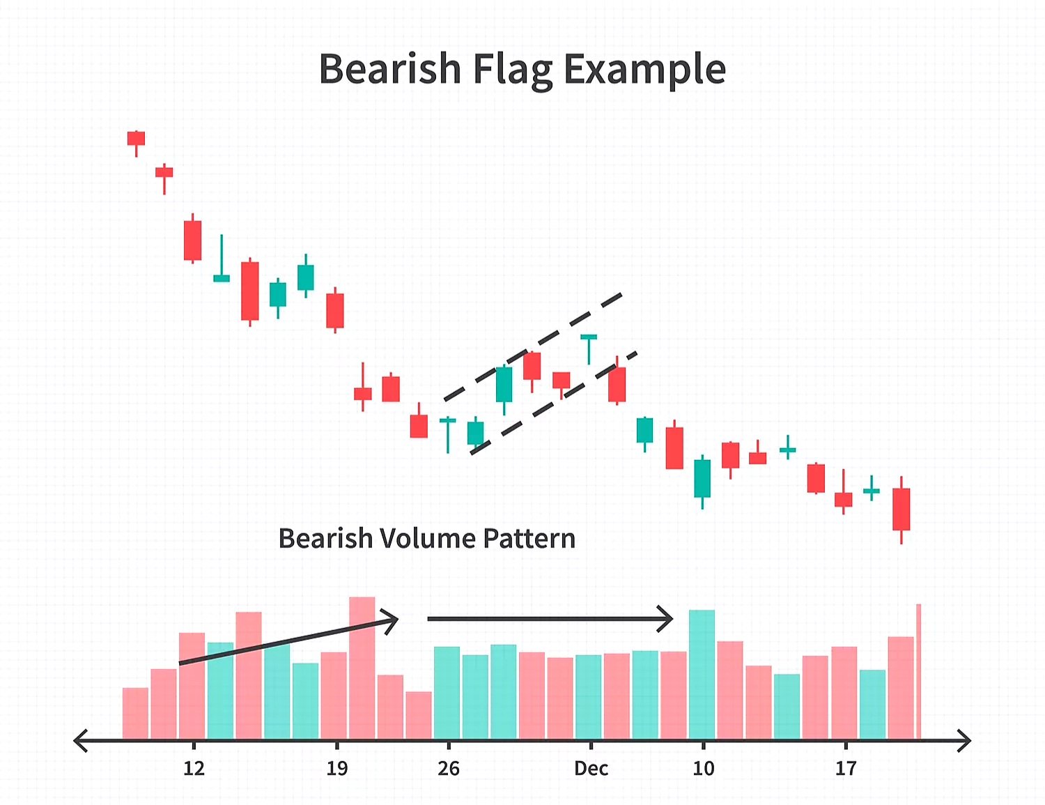 في نمط العلم الهابط، لا ينخفض الحجم دائمًا أثناء التوحيد. والسبب في ذلك هو أن تحركات الأسعار الهابطة والهابطة عادة ما تكون مدفوعة بخوف المستثمرين وقلقهم من انخفاض الأسعار. وكلما انخفضت الأسعار أكثر، كلما شعر المستثمرون المتبقون بإلحاح أكبر لاتخاذ إجراء.